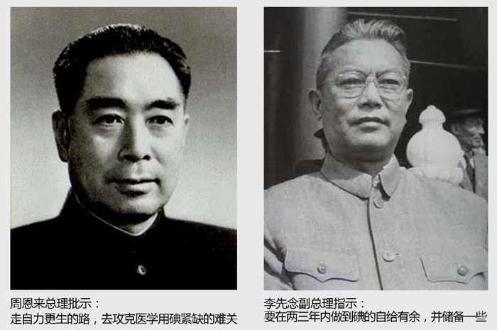 上世紀 60 年代 ,是一個嚴重缺碘的年代。碘是國家的重要戰略物資,對于國計民生有著舉足輕重的作用。新中國成立后,我國所需要的碘基本依賴進口。隨著“冷戰”的加劇,西方國家對我國實行經濟封鎖,并采取“禁運”政策中斷了我國碘的來源。為了打破“封鎖”,從根本上改變我國缺碘的嚴峻形勢,周恩來總理作出重要批示:“走自力更生的道路,去攻克醫學用碘緊缺的難關。”李先念副總理指示:“要在兩三年內做到碘的自給有余,并儲備一些。”